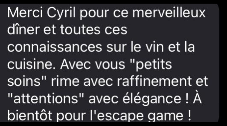 Nous avons fait un escape game œnologique. Une première! Un endroit charmant, un hôte très sympathique. Nous avons en plus appris des choses sur le vin. Nous avons passer un bon moment. Je recommande